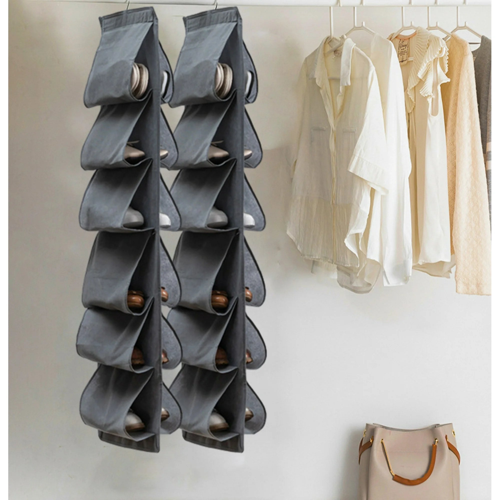 - This hanging handbag organizer can hold 12 Bags