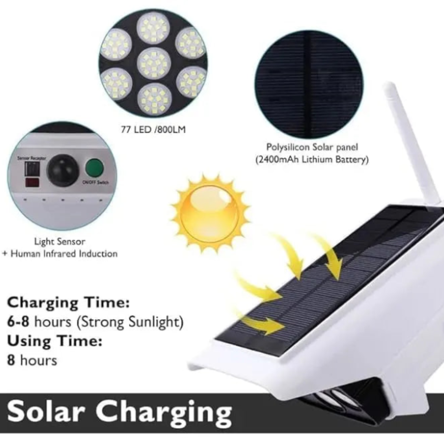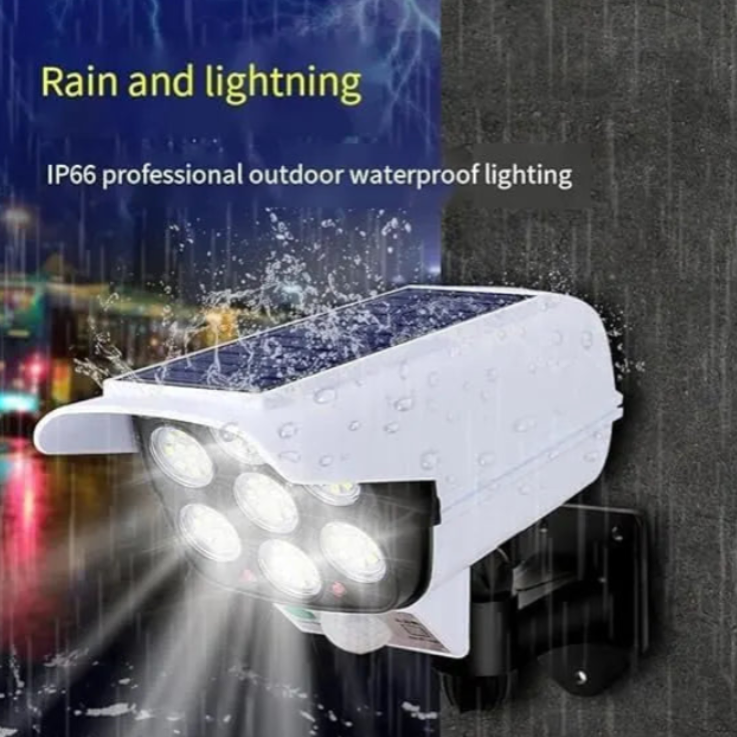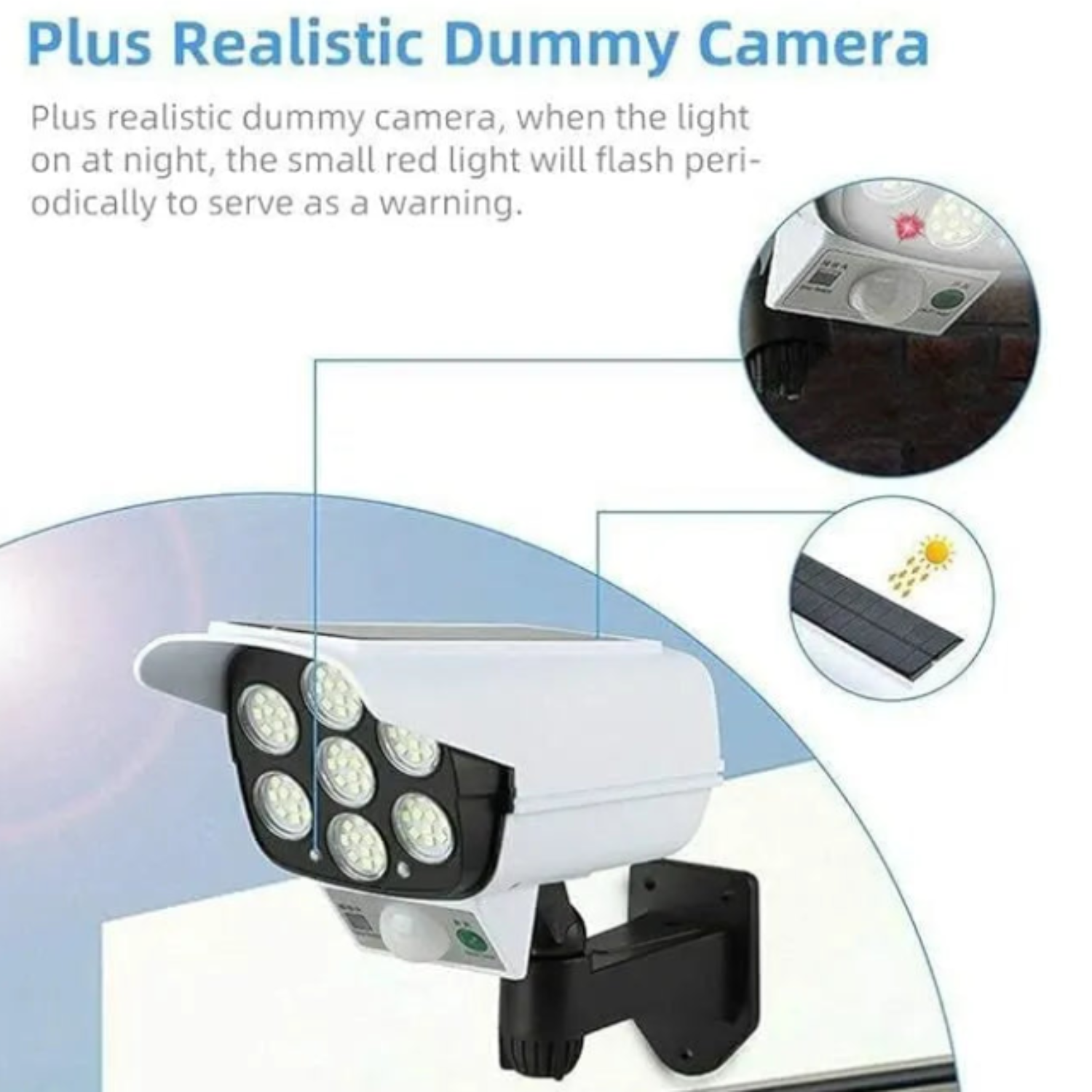 2-in-1 Solar Light & Simulation Camera: This unique light features 77 bright LEDs that provide ample illumination for your outdoor space. Alongside the light, the realistic dummy camera includes a flashing red light, adding an extra layer of security and warning potential intruders when it activates at night.