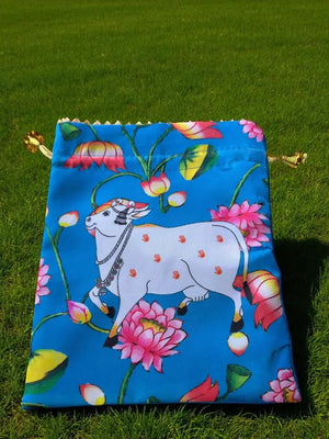 Elegant Design: Trendy cow print adds a modern twist to traditional Indian potlis.