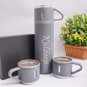 Personalized Double Wall Vacuum Insulated Flask Set – 500ml Stainless Steel Bottle with 2 Cups | Leak-Proof, Hot & Cold Thermos for Travel, Office & Gifting (Random Color)
