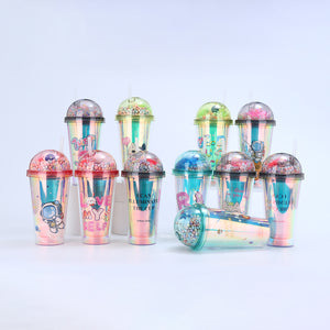Double Layer Portable Cute Water Cup, Sipper with Straw and LED Light