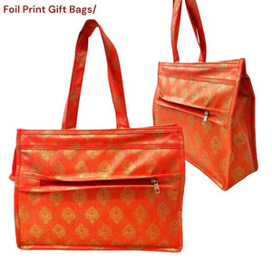 Festive Appeal: The combination of vibrant colors, traditional foil prints, and durable materials creates a bag that embodies the spirit of Indian festivals. This thoughtful presentation elevates the act of gift-giving and adds a touch of cultural significance.