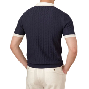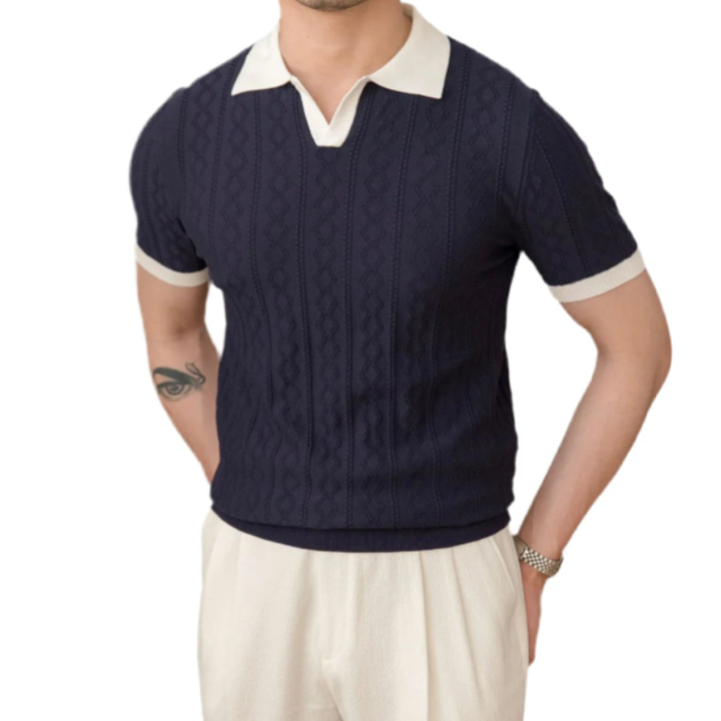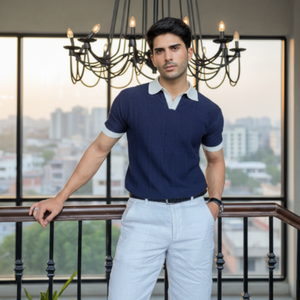 Midnight Blue Polo T-Shirt – Luxury Jacquard Knit, Buttonless Design, Lightweight & Breathable