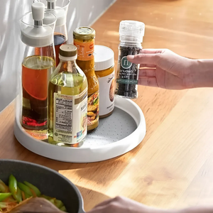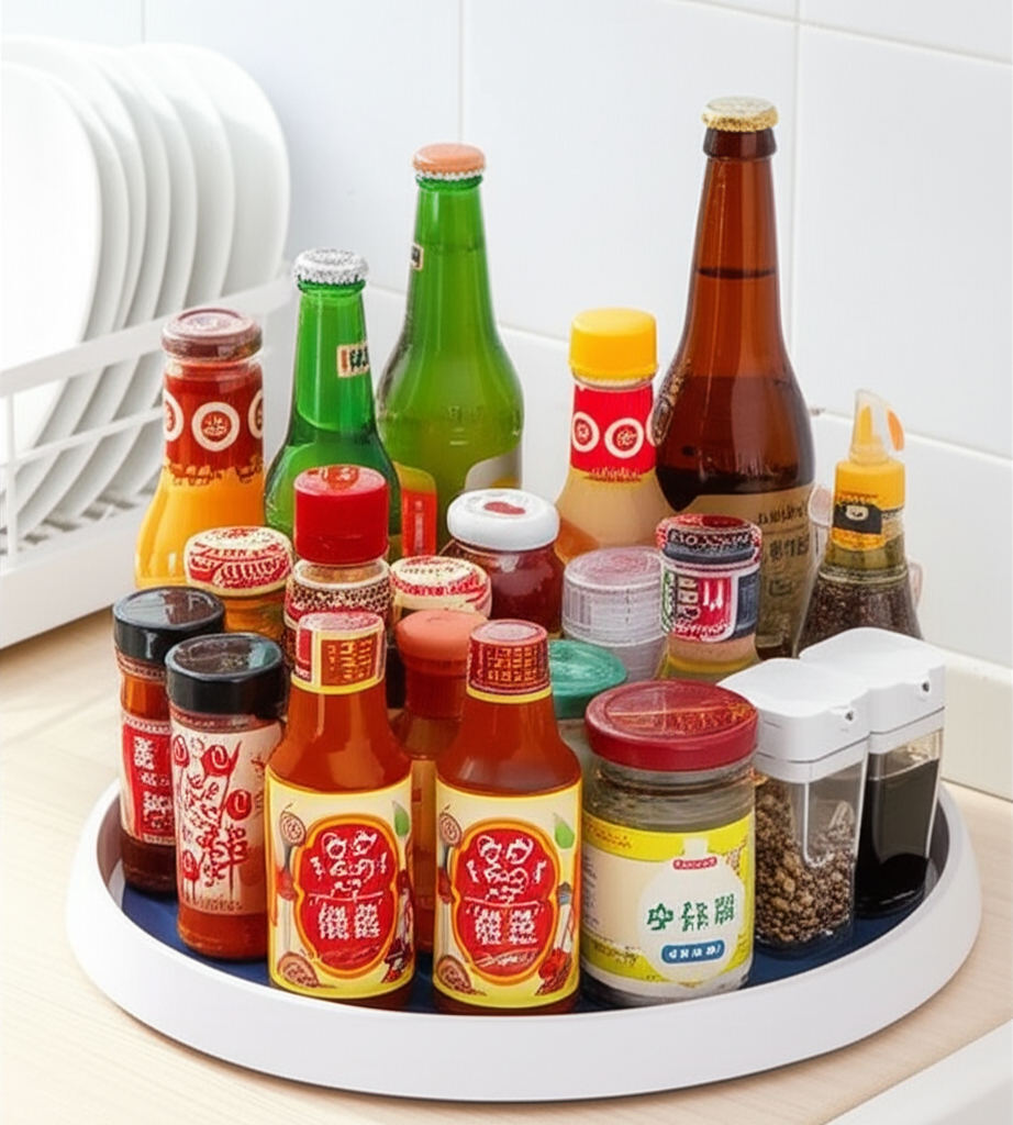 Function: Rotating tray for organizing condiments, cosmetics, or pantry essentials