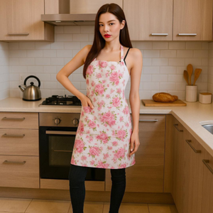Polyester apron featuring an elegant pink floral design