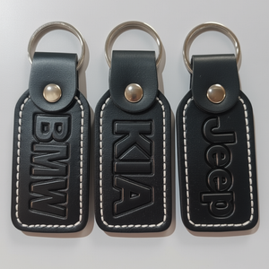 Premium Black Leather Keychain – BMW / KIA / Jeep Embossed logos with metallic key rings and snap closures (Random color-Pack of 1)