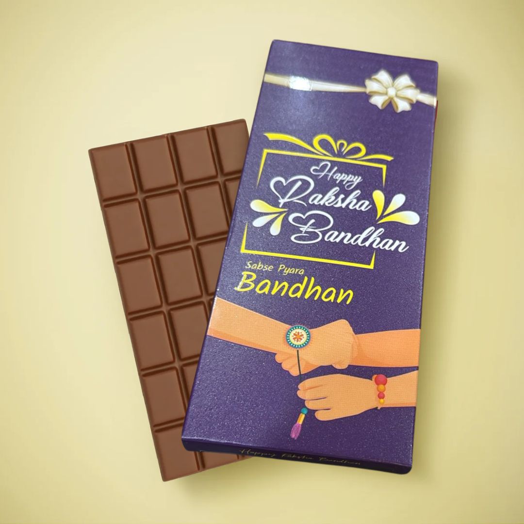 Celebrate the sweetest bond between siblings with this Rakhi Special Chocolate Bar Box. Designed in an elegant purple finish, the box features a heartfelt “Happy Raksha Bandhan” message with “Sabse Pyara Bandhan” printed underneath — making it a perfect gifting choice for the occasion.