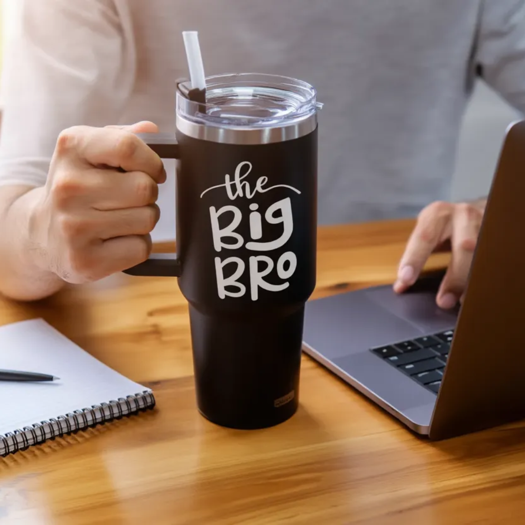 Introducing our 40 Oz Insulated Tumbler with Handle, designed to keep your drinks hot or cold for hours. This versatile, vacuum-insulated tumbler fits most cup holders and can be used as a travel coffee mug, iced coffee cup, or water bottle.