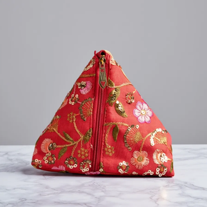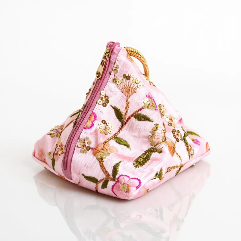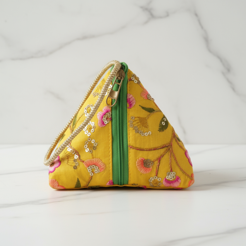 Samosa Triangle Shape Potli Bag Purse with Zipper for Women – Retro Silk Hand-Carry Ethnic Pouch for Parties & Festive Occasions(Random color-Pack of 1)