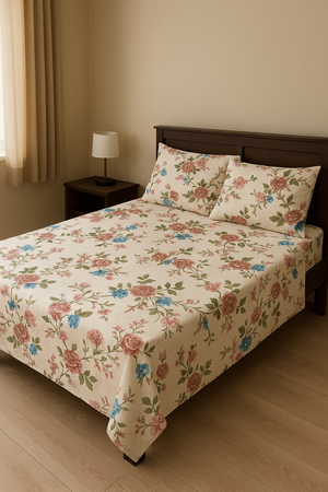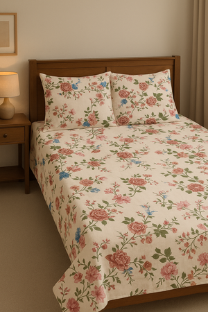 floral print bedsheet | spring bloom bedsheet | green leaf bedsheet design | cotton bedsheet double bed | bedsheet with pillow covers | floral bedsheet for summer | breathable bedsheet online | premium bedsheet combo | colorful flower bedsheet | machine washable floral bedsheet