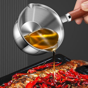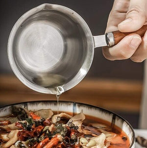 Saucepan constructed from durable stainless steel combined with a stylish wooden handle, ensuring both longevity and a comfortable grip.