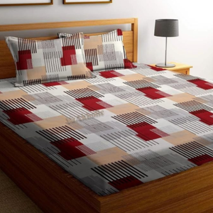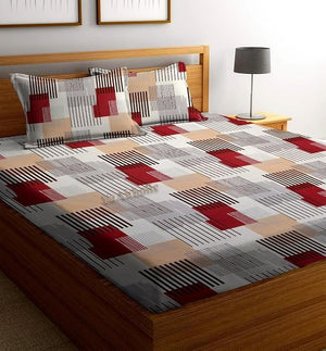 Urban Grid Geometric Bedsheet Set – Maroon, Beige & Grey Abstract Design – Double Bed Bedsheet with Pillow Covers