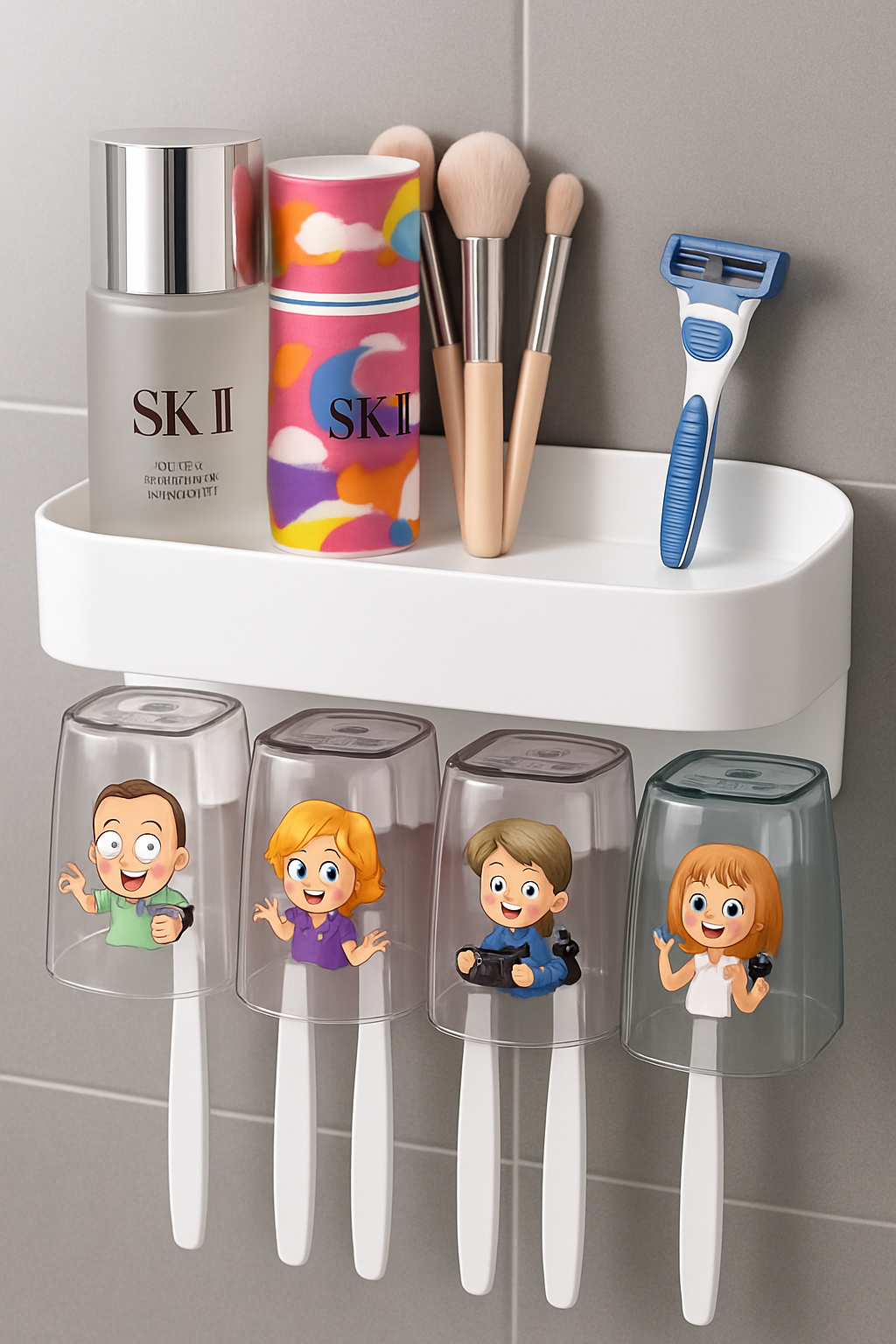Wall-Mounted Plastic Bathroom Organizer – 8 Toothbrush Holders with 4 Cartoon Cups & Storage Rack, White Bathroom Shelf for Kids & Family